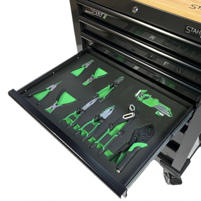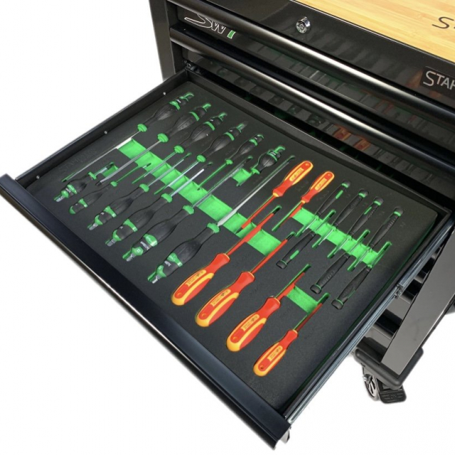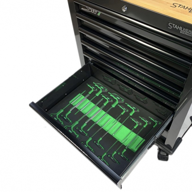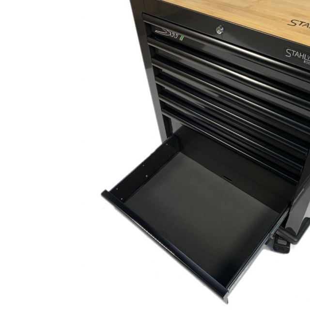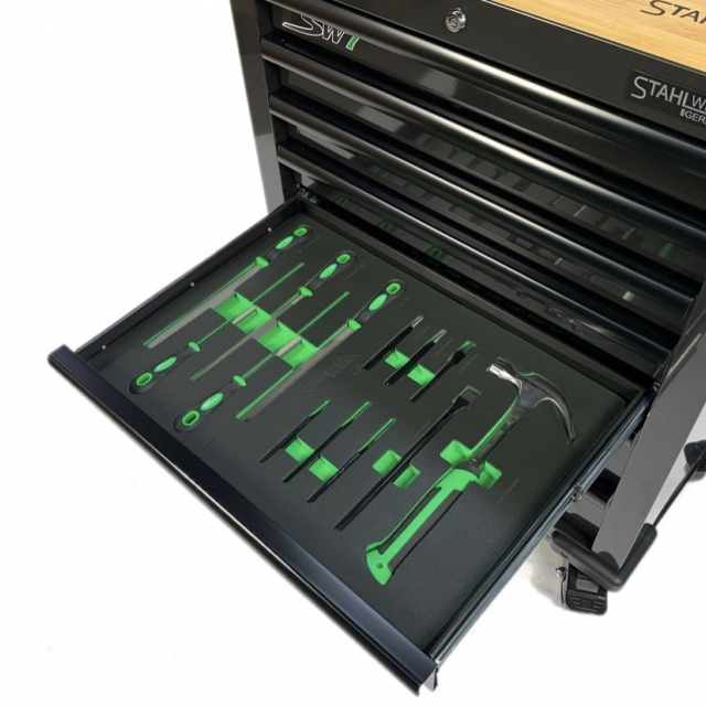 Door middel van de foam inlays kunt u na de werkzaamheden erg simpel zien of de gereedschapsset compleet is. Deze gereedschapswagen is simpel verplaatsbaar door de stevige stuurgreep en de robuuste vier wielen waarvan twee zwenkwielen met rem. Deze gereedschapswagen is geheel afsluitbaar door middel van 2 sleutels passend op het cilinderslot. De wagen beschikt over een extra sterk bamboehouten bovenblad.