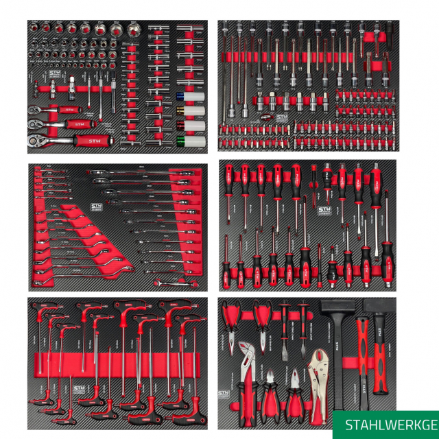Dieser STWXL werkstattwagen verfügt über 7 kugelgelagerte schubladen, davon 6 gefüllte schubladen mit 295-teiligen werkzeugen.