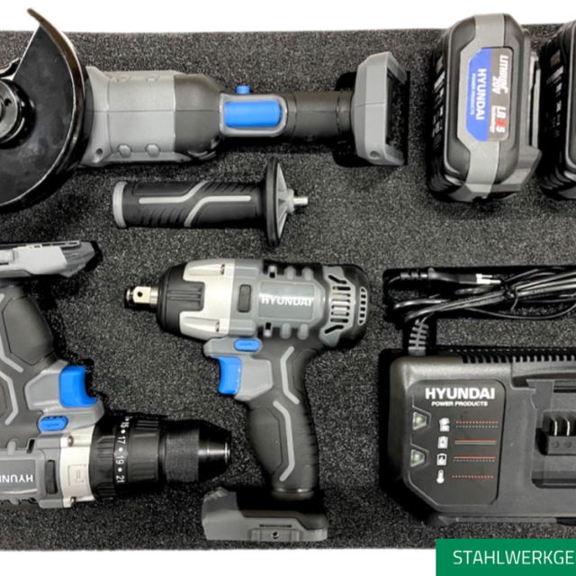 Die untere Schublade ist gefüllt mit heavy duty werkzeugen von HYUNDAI POWER PRODUCTS 20V 5.0ah und wird in einem Schaumstoffmodul aufgeräumt.