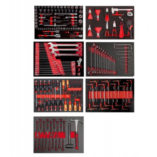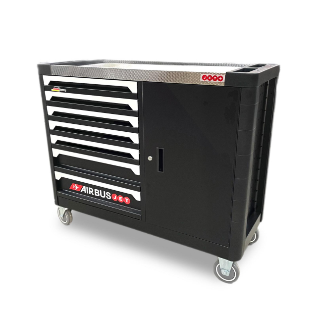 Dieser JET AIRBUS Werkzeugwagen hat sieben kugelgelagerte Schubladen, davon 7 mit Werkzeug gefüllt und mit einem extra Fach für Aerosoldosen. Die Werkzeuge sind in sechs stabilen Moosgummi-Modulen untergebracht, so dass sie optimal geschützt sind. Anhand der Schaumstoffeinlagen können Sie nach der Arbeit leicht erkennen, ob der Werkzeugsatz vollständig ist.
