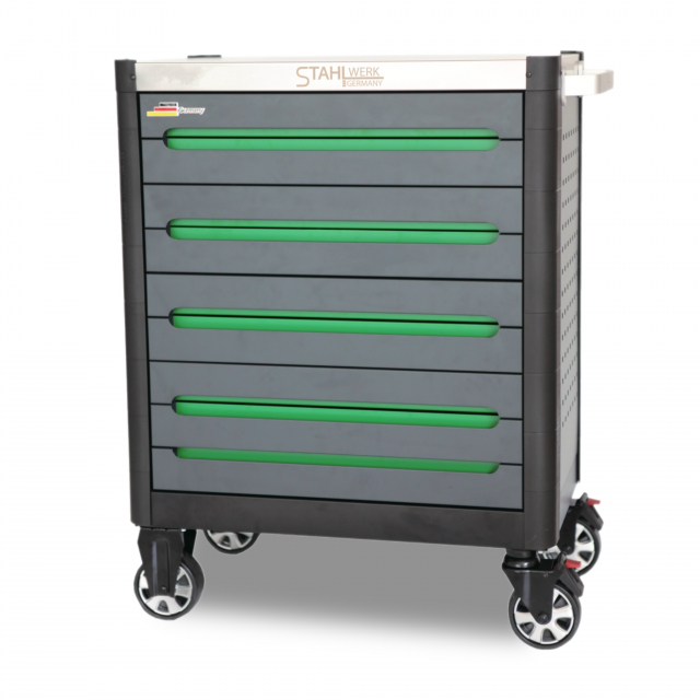 Dieser Werkzeugwagen SW9 von Stahlwerk verfügt über 9 kugelgelagerte Schubladen, von denen 9 mit Werkzeugen gefüllt sind.