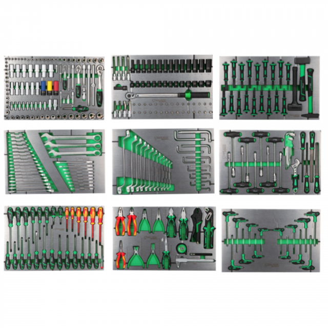 Die Werkzeuge werden in stabilen Moosgummimodulen aufbewahrt, sodass sie optimal geschützt sind.