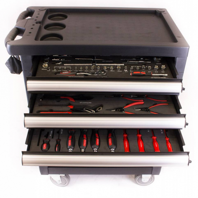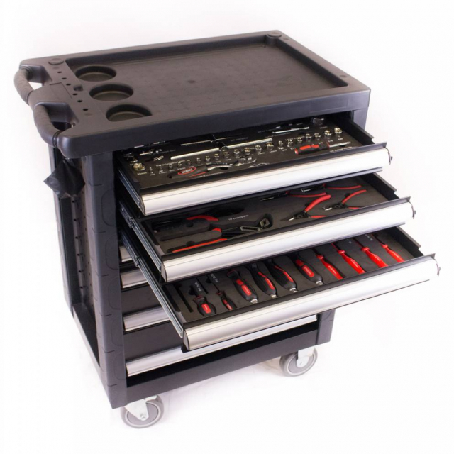 This tool trolley has seven drawers with ball bearings which 5 drawers filled with tools. The tools are stored in five solid foam modules making them optimally protected. Through the foam inlays can see very simple after the work or the tool is complete. The tool carriage is simple displaceable by the firm steering grip, and the robust four wheels of which two are in turn and brake. This tool trolley is completely closed off by means of the cylinder lock. The tool trolley has a lifetime warranty (EC 30years) on manufacturing defects. The tool is a 5 year warranty.